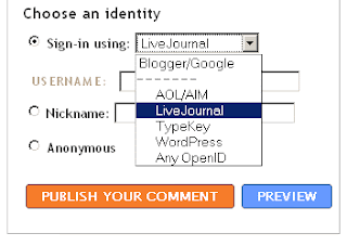You, too, can leave comments on detergent bin if you are not a Blogger/Google user or if you don’t want to be anonymous. Using the new OpenID protocol, users of LiveJournal, WordPress, Movable Type, AOL, Yahoo! and dozens of other providers can post comments on others’ sites. Cool! Now you can leave comments and provide a link back to your blog.